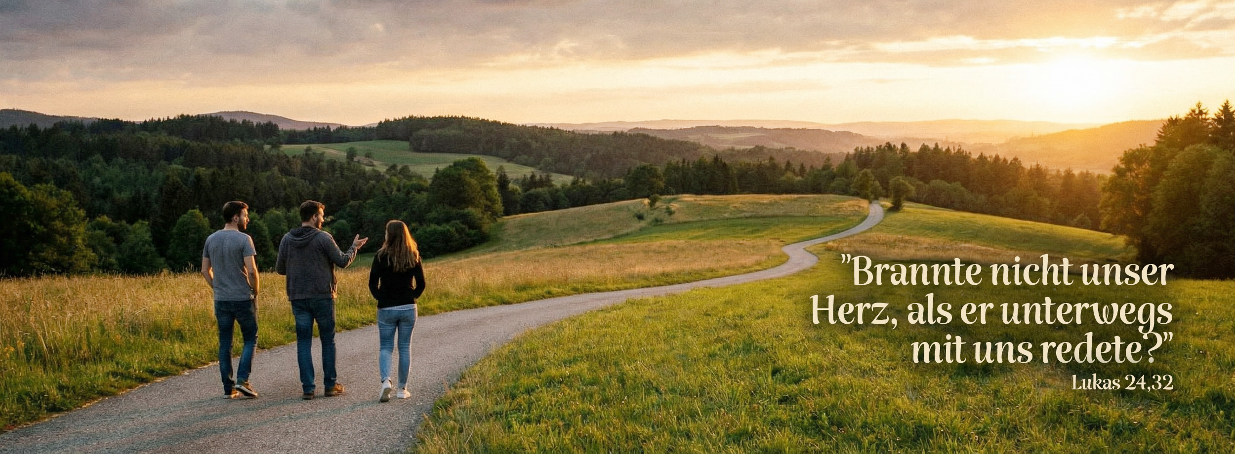 Das Motto „Unterwegs mit Jesus“ ist Teil unseres Gemeindenamens. Es geht auf eine Begegnung zurück, von der im Neuen Testament berichtet wird (Lukas 24). Nach der Auferstehung von Jesus gehen zwei seiner Jünger mit einem Begleiter in das Dorf Emmaus. Dieser Begleiter ist Jesus selbst, aber sie erkennen ihn erst, als sie in Emmaus gemeinsam zu Abend essen und er das Brot austeilt und seinen Segen darüber spricht. „Brannte nicht unser Herz, als er unterwegs mit uns sprach und uns den Sinn der Schrift erklärte?“, sagen sie nur wenig später.
